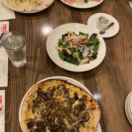 Yum yum yum. We really need to come here more often. Went to lunch with some friends today we had the mushroom pizza which was very special and quite fabulous and then the meat pizza. Two of their green salads everything was really really good wide variety of wine choices small beer list but all in all excellent will be back soon